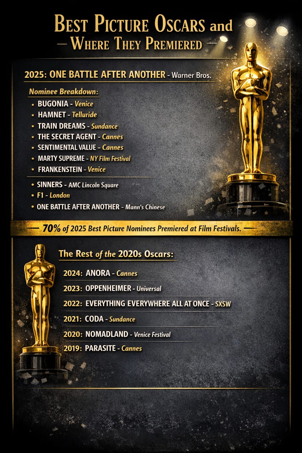 Recent Best Picture winners including ANORA (Cannes), EVERYTHING, EVERYWHERE, ALL AT ONCE (SXSW), CODA (Sundance), NOMADLAND (Venice), and PARASITE (Cannes) all began their runs on the festival circuit.