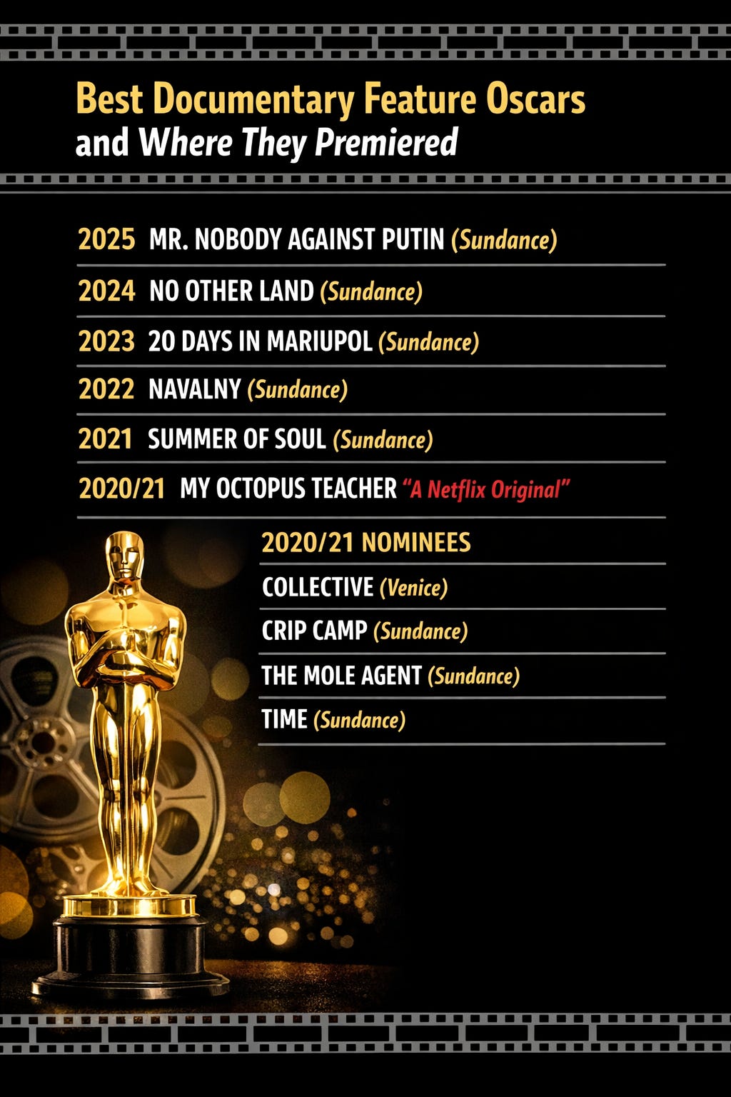 In the documentary category this year, every Oscar-nominated film emerged from the Sundance ecosystem, and across the broader awards landscape, the 2020s for docs have been anchored in festival premieres.
